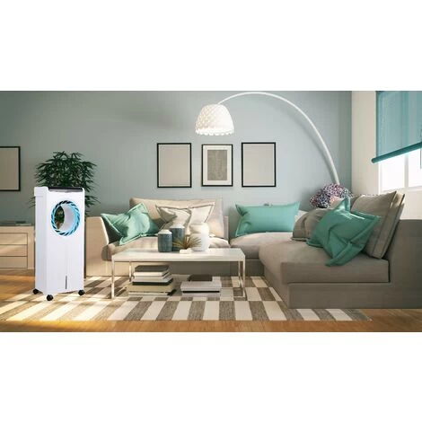 | Bereit für den Sommer?!… Sagen Sie drückender Hitze und schlechter Luft den Kampf an… Dieser 3in1 Air Cooler verfügt über einen Ventilator, der durch einen 4 L Wassertank nicht nur für angenehm frische und kühle Luft sorgt, sondern diese auch befeuchtet und filtert. Bei diesem Gerät wird keine Abluft erzeugt. Das Gerät ist sofort einsatzbereit und erzeugt sofort die erforderliche und gewünschte Kühle. Auf Wunsch sogar oszillierend. Ein Allrounder, der mit viel Effizienz und wenig Verbrauch der Hitze und schlechten Luft trotzt. Gleichzeitig verbessert er die Raumluft. Der Aircooler unterscheidet sich von herkömmlichen Ventilatoren dadurch, dass die Luft nicht nur gekühlt, sondern auch befeuchtet und gereinigt wird um das Raumklima zu verbessern. Der Aircooler ist für alle Arten von Räumen bis zu ca. 50m² geeignet. Ebenso lässt sich der Aircooler mit der mitgelieferten Fernbedienung steuern oder ganz einfach durch das Touch Bedienfeld. Highlights: