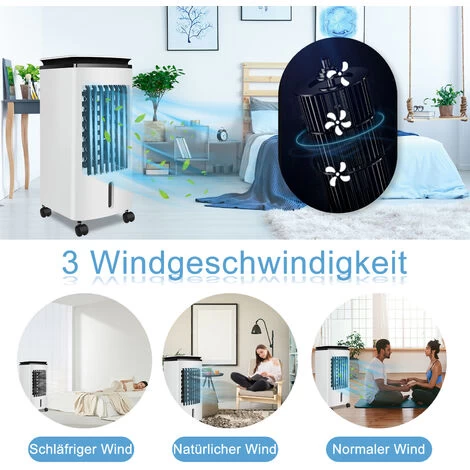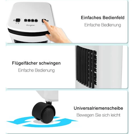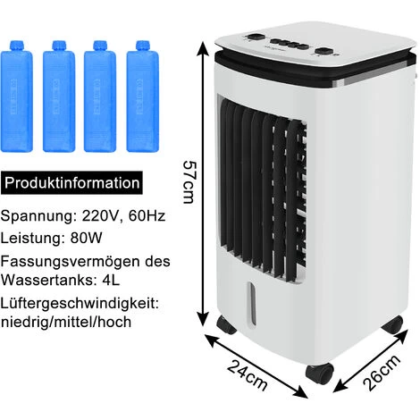 Verschiedene Betriebsarten stehen zur Verfügung, 3 Luftmengenstufen einstellbar, Oszillationsfunktion umschaltbar, 4 Liter Wassertank + 4 Eiskristalle, 4 Räder, leicht zu bewegen.