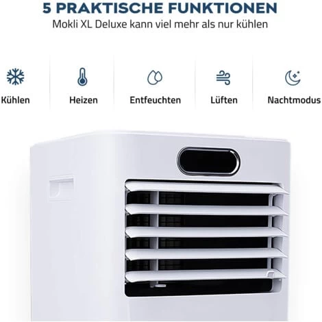 Diese Klimaanlage ist mit ihren vier verschiedenen Funktionen ein echter Alleskönner. Die Mokli DELUXE kann nicht nur Kühlen, sondern Heizen, Entfeuchten und Lüften. Die Lüfterfunktion verhindert unter anderem Schimmelbildung an den Wänden oder unangenehme Gerüche. Im Zusammenspiel mit dem Timer und der Entfeuchtungsfunktion bewahren Sie auch in tropischen Nächten einen kühlen Kopf. Das Beheizen kleiner Räume oder das Unterstützen der vorhandenen Raumheizung ist ebenso möglich und führt somit schneller zur wohligen Wärme.