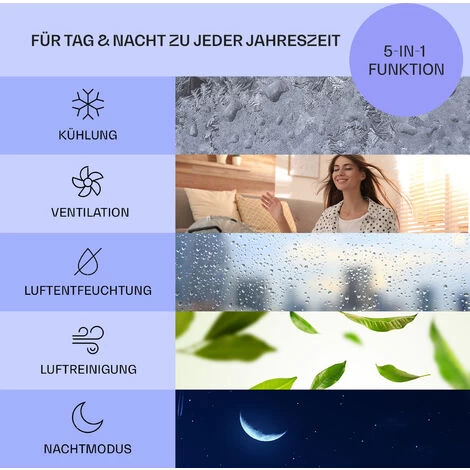 5-in-1: Klimagerät, Ventilator, Luftentfeuchter, Luftreiniger und Nachtmodus