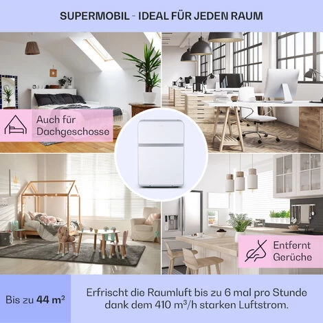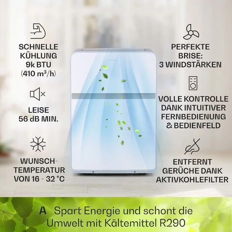 Starke Leistung: 9.000 BTU/2,6 kW Kühlkapazität für Räume zwischen 26-44 m² bei einem Luftdurchsatz von 410 m³/h max.