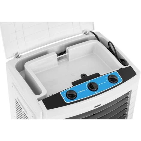 Der mobile Luftkühler UNI_COOLER_06 ist ein nützliches Gerät fürs ganze Jahr: Im Sommer kühlt er Ihre Räume, im Winter bewahrt Sie der Befeuchter vor trockener Heizungsluft. Dazu filtert der Luftreiniger effektiv Staub und Pollen aus der Luft. Da das Gerät keinen Abluftschlauch, sondern lediglich kaltes Wasser zur natürlichen Verdunstung benötigt, können Sie es dank der vier Lenkrollen überall aufstellen. Der sparsame 3-in-1 Air Cooler wälzt bis zu 3.000 m³/h Luft um und ist über drei Drehregler kinderleicht steuerbar. Der Ventilator bläst mit bis zu 9 m/s, wobei die Oszillation die Zirkulation verstärkt. Der 40 l Wassertank sorgt bei einem Verbrauch von 3 bis 4 l/h für eine Abkühlung um 3 bis 7 °C.