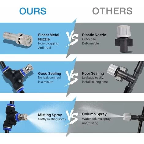 【Breite Anwendung】: Das System der Nebelkühlung findet breite Anwendung in Gärten, Trampolin-Wasserparks, Landschaftsbau, Gewächshäusern, Befeuchtung, Außenkühlsystemen, Epidemieprävention, Desinfektionsmittelsprühen, desodorierender Luftreinigung und Pools Nebelkühlung, Nebel-Mückenschutzsystem usw.