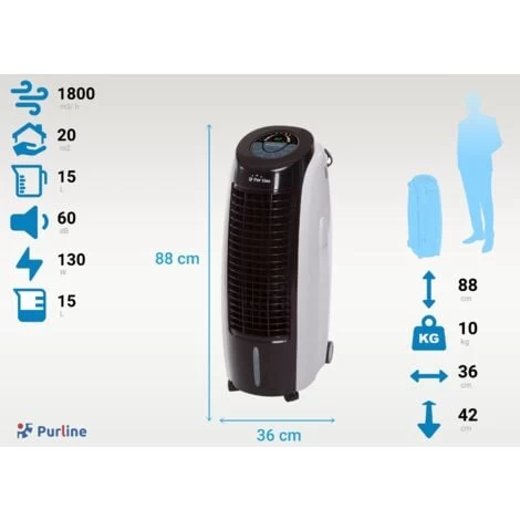 Mit seinem kompakten Design in Weiß mit schwarzen Details, seinen Maßen (LxTxH: 36 x 42 x 88 cm) und seinem Gewicht (9,5 kg) ist er ideal für Räume bis zu 18 m2, und dank seiner Räder können Sie ihn nach Bedarf bewegen.
