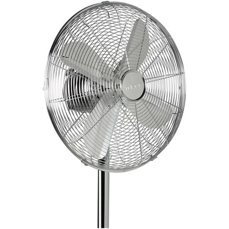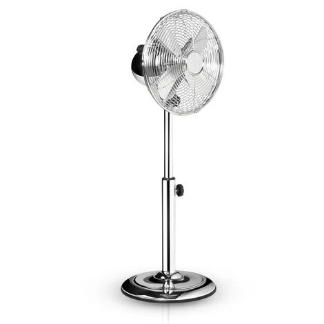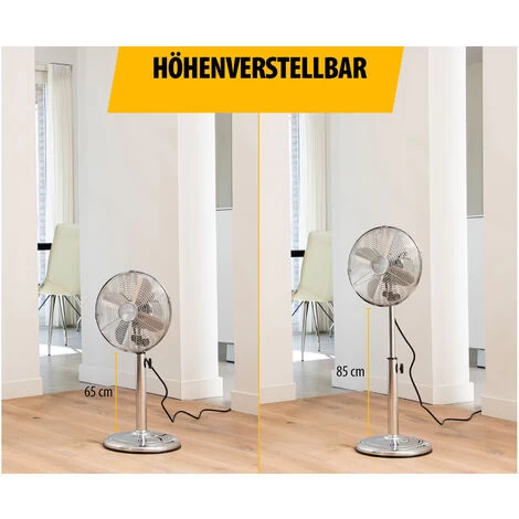 Der Standlüfter hat einen Durchmesser von 25 cm und ist in der Höhe verstellbar von 65 bis 85 cm. Die drei Flügel sind durch einen verchromten Sicherheitskäfig geschützt, dieser lässt sich im Winkel von 30 Grad neigen.