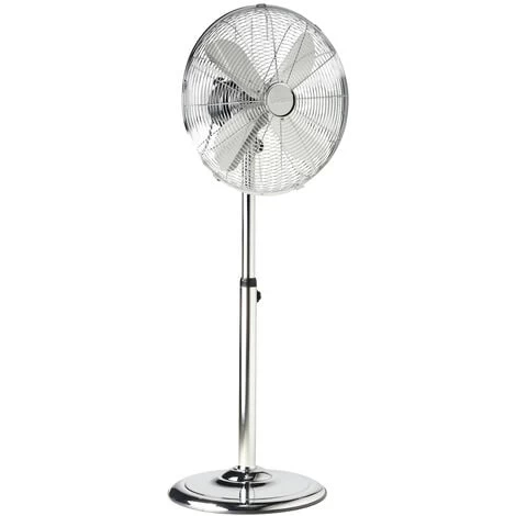 Der Standlüfter hat einen Durchmesser von 40 cm und ist in der Höhe verstellbar von 85 bis 128 cm. Die vier Flügel sind durch einen verchromten Sicherheitskäfig geschützt, dieser lässt sich im Winkel von 20 Grad neigen.