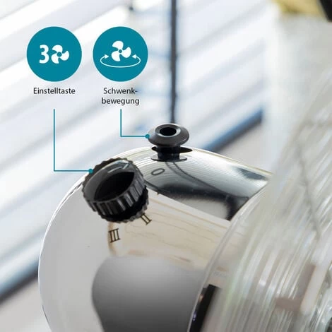Für frischen Wind und ein angenehmes Klima sorgen ein leistungsstarker Motor mit 50 Watt sowie drei einstellbare Lüfter Stufen mit unterschiedlicher Leistung (900-1100-1200 U/m). Der Ventilator ist in einem 85 Grad Winkel oszillierend, das heißt er bewegt sich hin und her und verteilt so eine angenehme Brise im gesamten Raum. Selbstverständlich lässt sich der Luftkühler auch so einstellen, dass er die Luft nur in eine Richtung bläst.