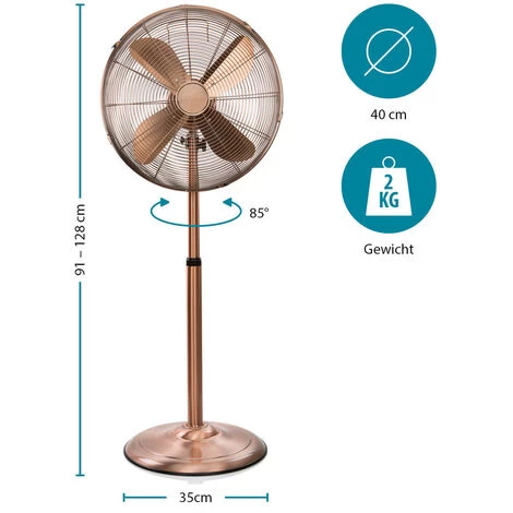 Der Ventilator hat einen Durchmesser von 40 cm und ist in der Höhe verstellbar von 85 bis 128 cm. Die vier Flügel sind durch einen Sicherheitskäfig geschützt. Dieser kann er in einem Winkel von 20 Grad geneigt werden.